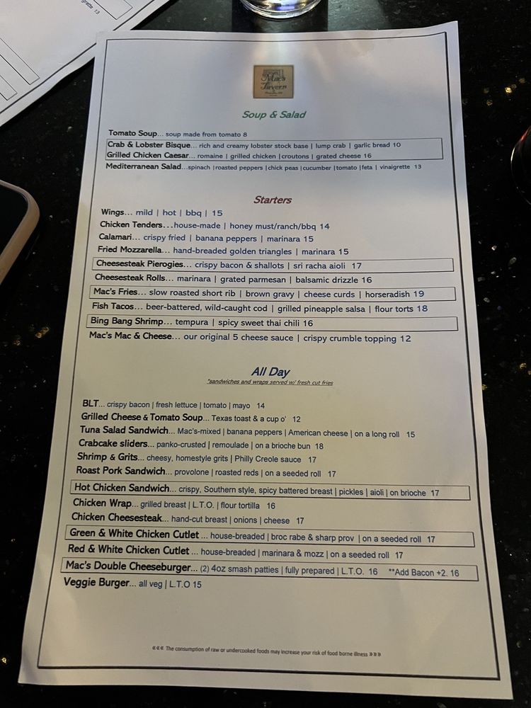 "Introducing the menu at Mac’s Tavern, located at 226 Market St in Philadelphia, PA, offers a variety of New American dishes. The restaurant provides a range of options for customers, including starters like Bing Bang Shrimp Tempura and Cheesesteak Pierogies. Their sandwiches and wraps include favorites like the Chicken Cheesesteak Sandwich and Crab Cake Sandwich. For soup and salad lovers, Mac’s Tavern serves up Broccoli Cheddar Soup and Chicken Caesar Salad. With amenities such as outdoor seating, TV, and a full bar, Mac’s Tavern provides a comfortable and lively atmosphere for patrons. Don't miss out on their Happy Hour specials and delicious food options, making it a great spot for dinner and late-night bites. Overall, Mac’s Tavern offers a casual dining experience with a diverse menu that caters to various preferences."